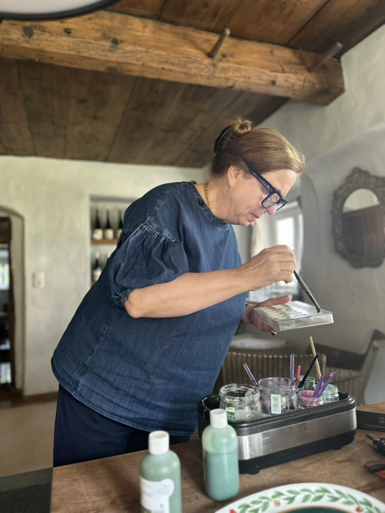 Während die Schokolade (bei Birgit am liebsten mit 62 Prozent Kakao) schmilzt, kann sie sich schon mal ihren Farben widmen. Die basieren auf Kakaobutter und brauchen auch eine gewisse Temperatur, um sie optimal verarbeiten zu können. Trotzdem härtet Kakaobutter irgendwann wieder aus. Erfinderisch wie Birgit ist, hat sie sich einen Joghurtbereiter angeschafft, der dem entgegenwirkt. Denn Pralinen zu bemalen, das dauert. Bestellungen von mehreren tausend Stück sind keine Seltenheit, zumal zwei hochklassige Hotels im Achental zu ihren Kunden zählen. Die verteilen Birgits kunstvolle Köstlichkeiten gerne in den Zimmern. Für solche Bestellungen muss sie ziemlich lang „malen“. Halb so wild: der Part macht ihr am meisten Spaß.