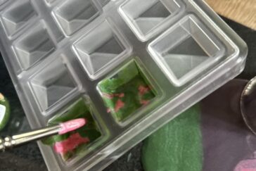 Vielleicht lässt sich die Wahl-Rottauerin deshalb „werkzeugtechnisch“ immer wieder etwas Neues einfallen: Pinsel, Schwämme, Nageldesign-Tools – sie hat schon viel ausprobiert. Gewusst wie lautet die Devise. Grundsätzlich poliert sie zunächst die Gussformen für die Pralinen. Auf diese Weise kommt der Glanz zustande. Dann folgen die Farben und Extras wie zum Beispiel Goldstaub. Im Anschluss lässt Birgit die geschmolzene Schokolade für die Hülle in die Form fließen. Wenn die erkaltet ist, folgen die Füllung und der Boden der Pralinen. Inklusive Konfektionierung benötigt Birgit gut und gerne drei Tage, bis eine größere Bestellung abgearbeitet ist.
