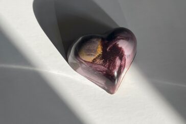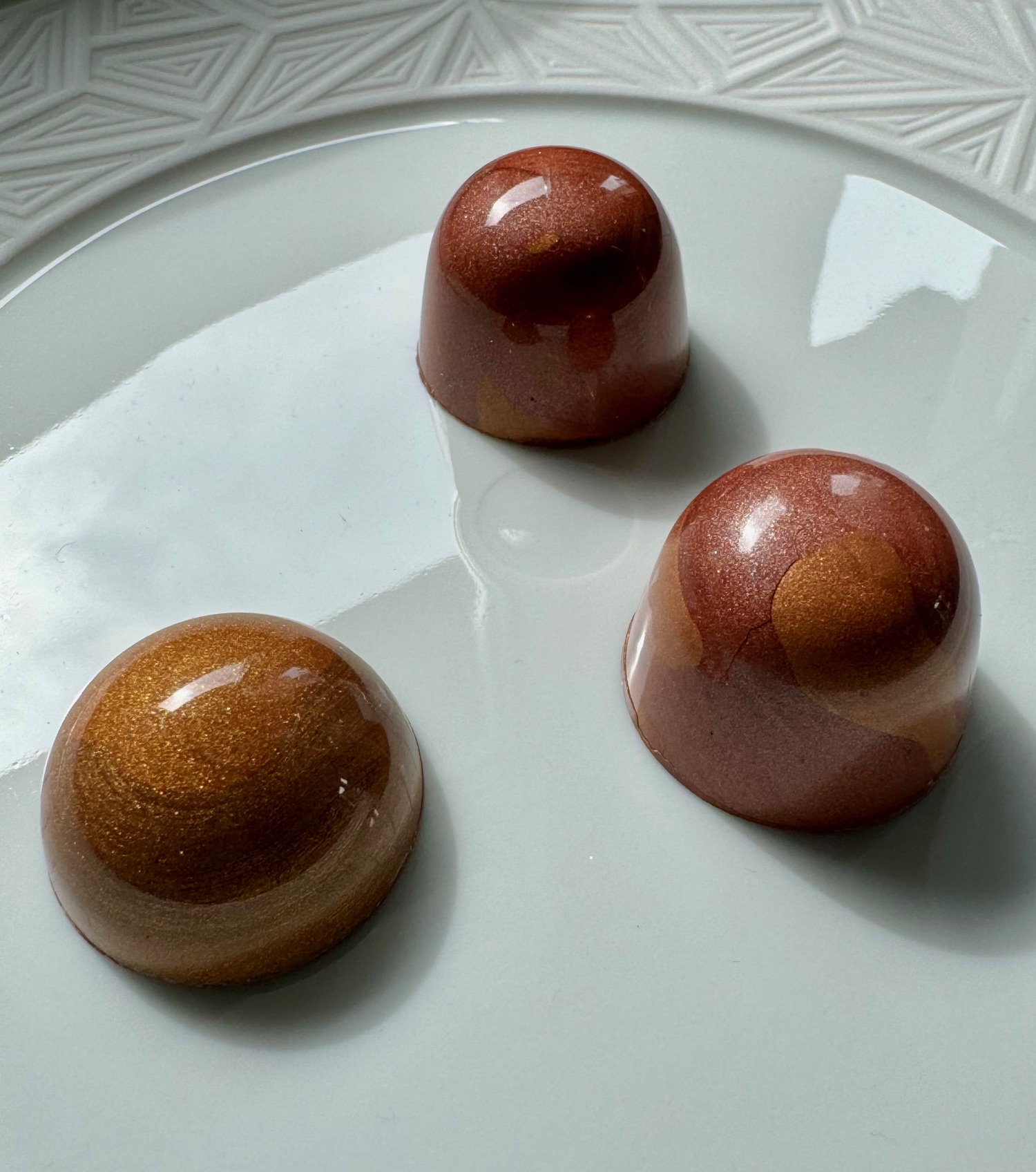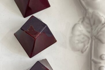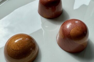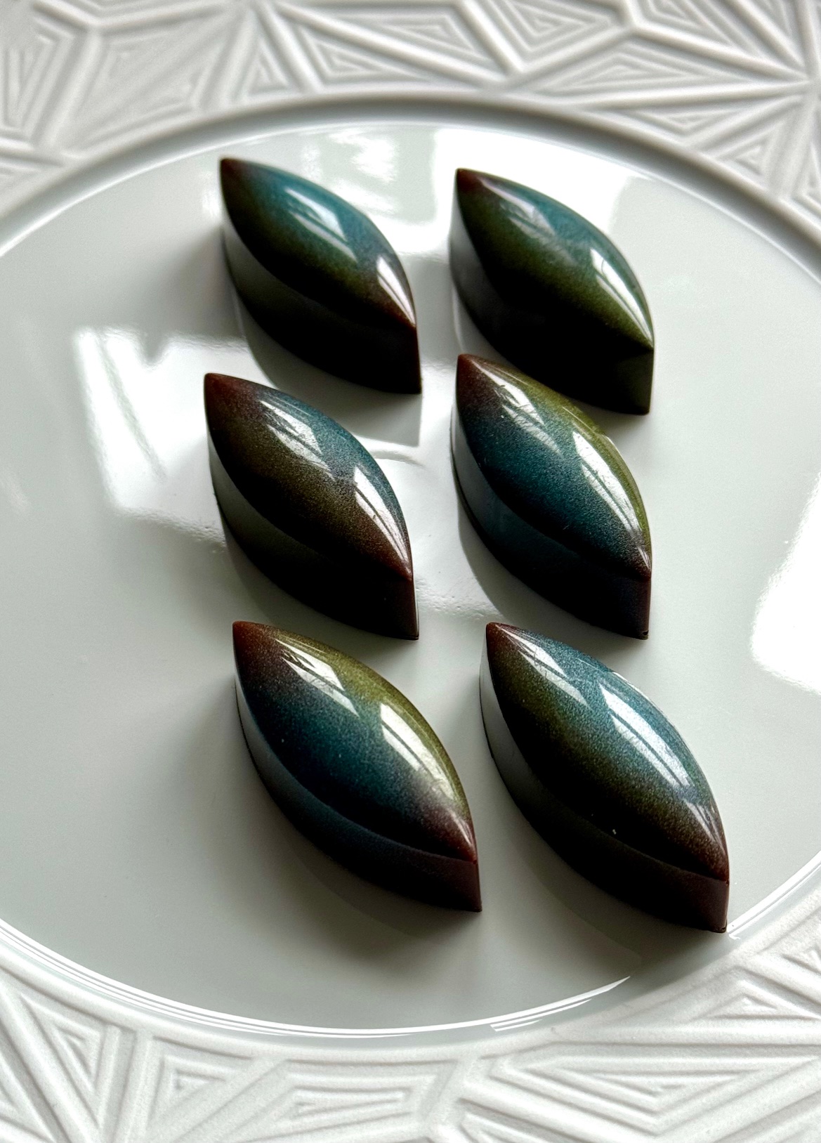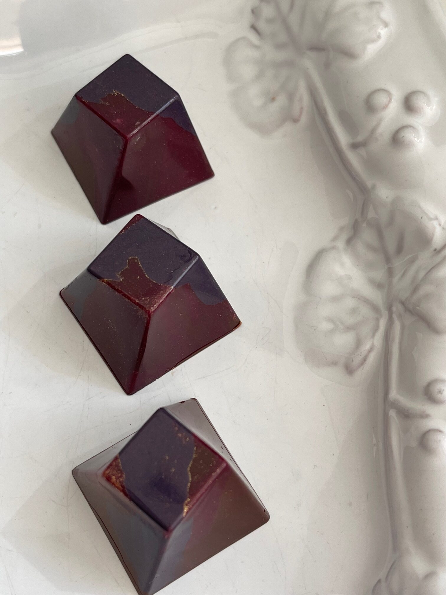 Wenn man eine Schachtel von Birgit Kunkels Pralinen öffnet, drängt sich eine Frage unmittelbar auf: Kann man die wirklich essen? Handelt es wirklich um Pralinen und nicht um Edelsteine? Das staunende Auge erblickt zum Beispiel grüne, glänzende Stücke mit farbigen Akzenten, manchmal golden bestäubt und außergewöhnlich geformt. Daneben etwas Achteckiges, Herzförmiges oder Tropfenförmiges, mit einem dunklen Lilaton überzogen und mit einem derartigen Glanz, dass man sich fast darin spiegeln kann. Manche funkeln golden mit farbigen Sprenkeln oder in unterschiedlichsten Rottönen. Aber keine gleicht der anderen. Jede einzelne dieser Pralinen ist ein Unikat, jede handgemacht.
