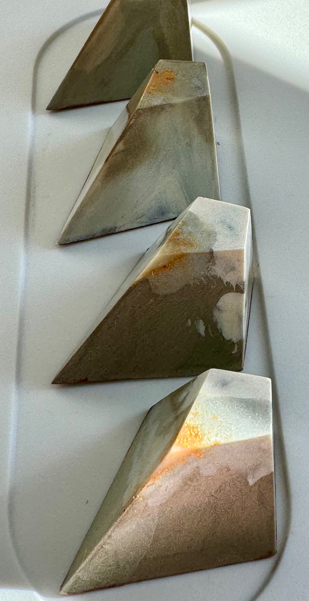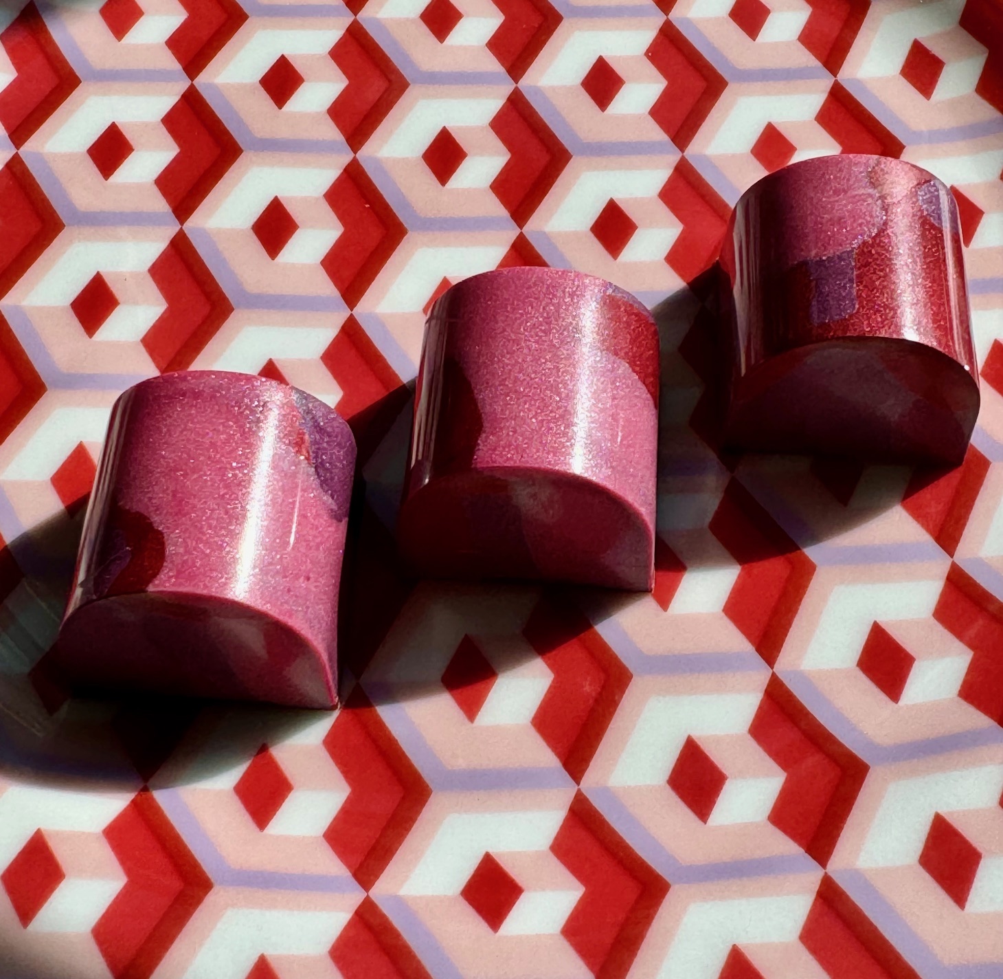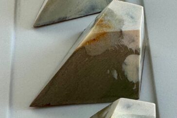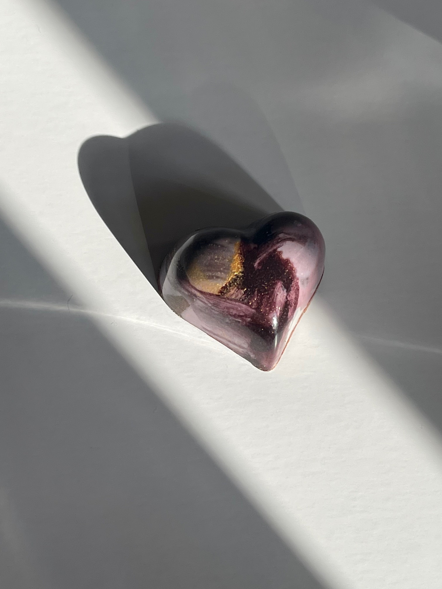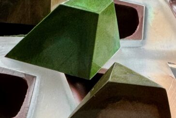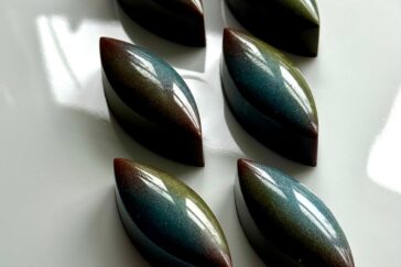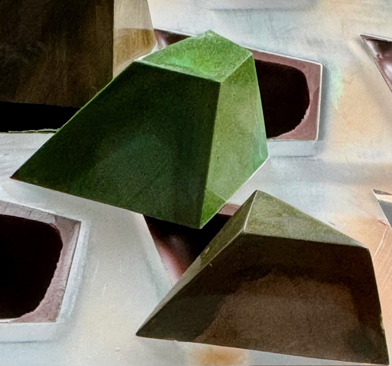 Wenn man eine Schachtel von Birgit Kunkels Pralinen öffnet, drängt sich eine Frage unmittelbar auf: Kann man die wirklich essen? Handelt es wirklich um Pralinen und nicht um Edelsteine? Das staunende Auge erblickt zum Beispiel grüne, glänzende Stücke mit farbigen Akzenten, manchmal golden bestäubt und außergewöhnlich geformt. Daneben etwas Achteckiges, Herzförmiges oder Tropfenförmiges, mit einem dunklen Lilaton überzogen und mit einem derartigen Glanz, dass man sich fast darin spiegeln kann. Manche funkeln golden mit farbigen Sprenkeln oder in unterschiedlichsten Rottönen. Aber keine gleicht der anderen. Jede einzelne dieser Pralinen ist ein Unikat, jede handgemacht.